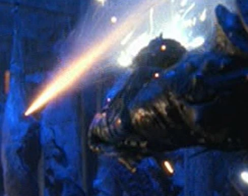 Top-Knot utilizando su cañón de muñeca durante su visita al planeta alienígena sin nombre.