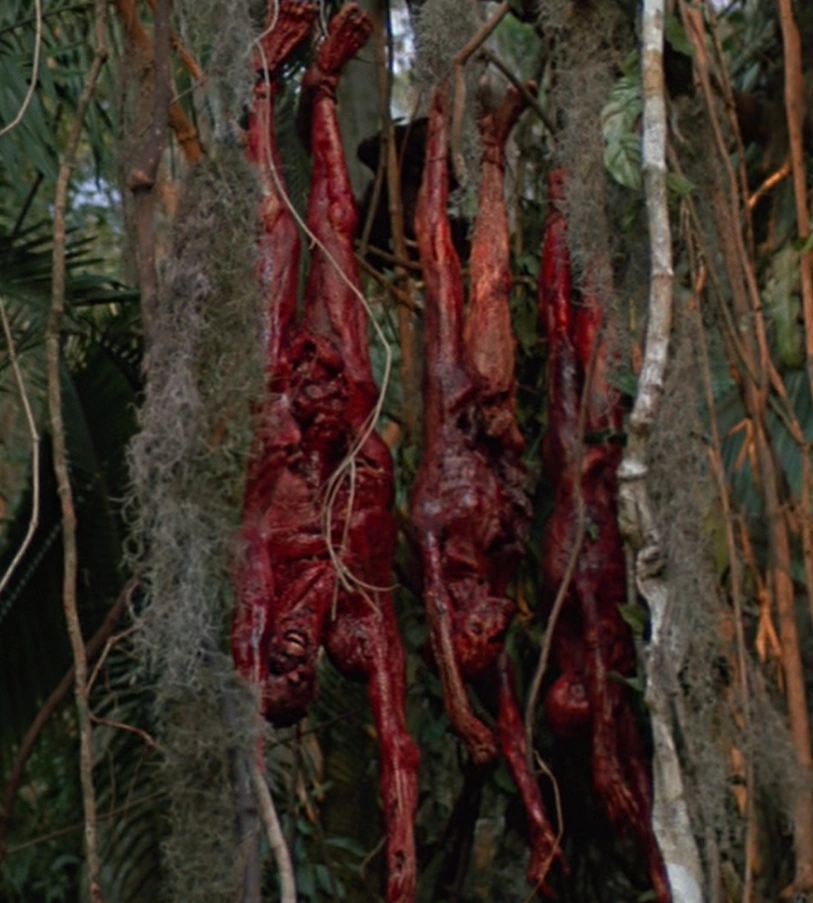 A diferencia de los trofeos que los Yautja se llevan a sus trophy rooms,[2] las presas desolladas y colgadas son aquellas consideradas como presas "fáciles" de asesinar,[1][2] algo que realizó el Jungle Hunter, dejando los cuerpos desollados de los Boinas verdes y de Hawkins colgados en los árboles pero reclamando los trofeos de Blain, Mac, Billy y Dillon.[1] Los cuerpos desollados son habitualmente colgados boca abajo por los tobillos desde una altura considerable y abandonados para intimidar a otras víctimas potenciales o a presuntos enemigos.