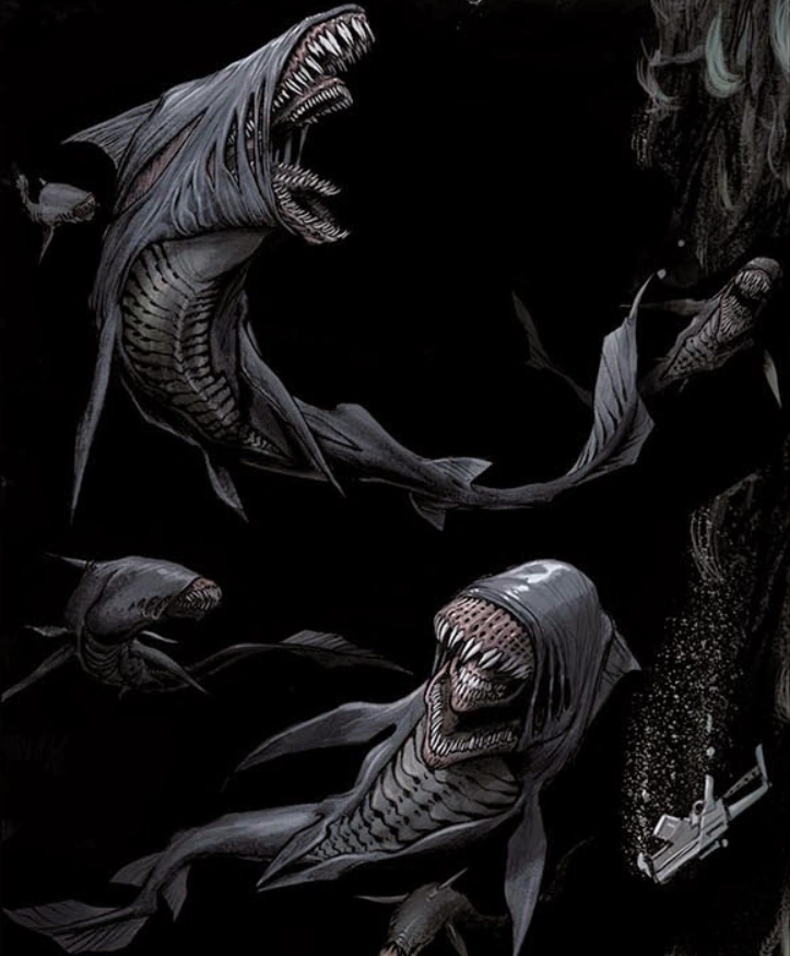 Estos peces extraterrestres fueron encontrados por la tripulación de la nave de comando Helios de la Geryon, que viajaron a LV-223 años después de la muerte de Peter Weyland pero para su desgracia, los tiburones terminaron muriendo a manos de los humanos restantes.
